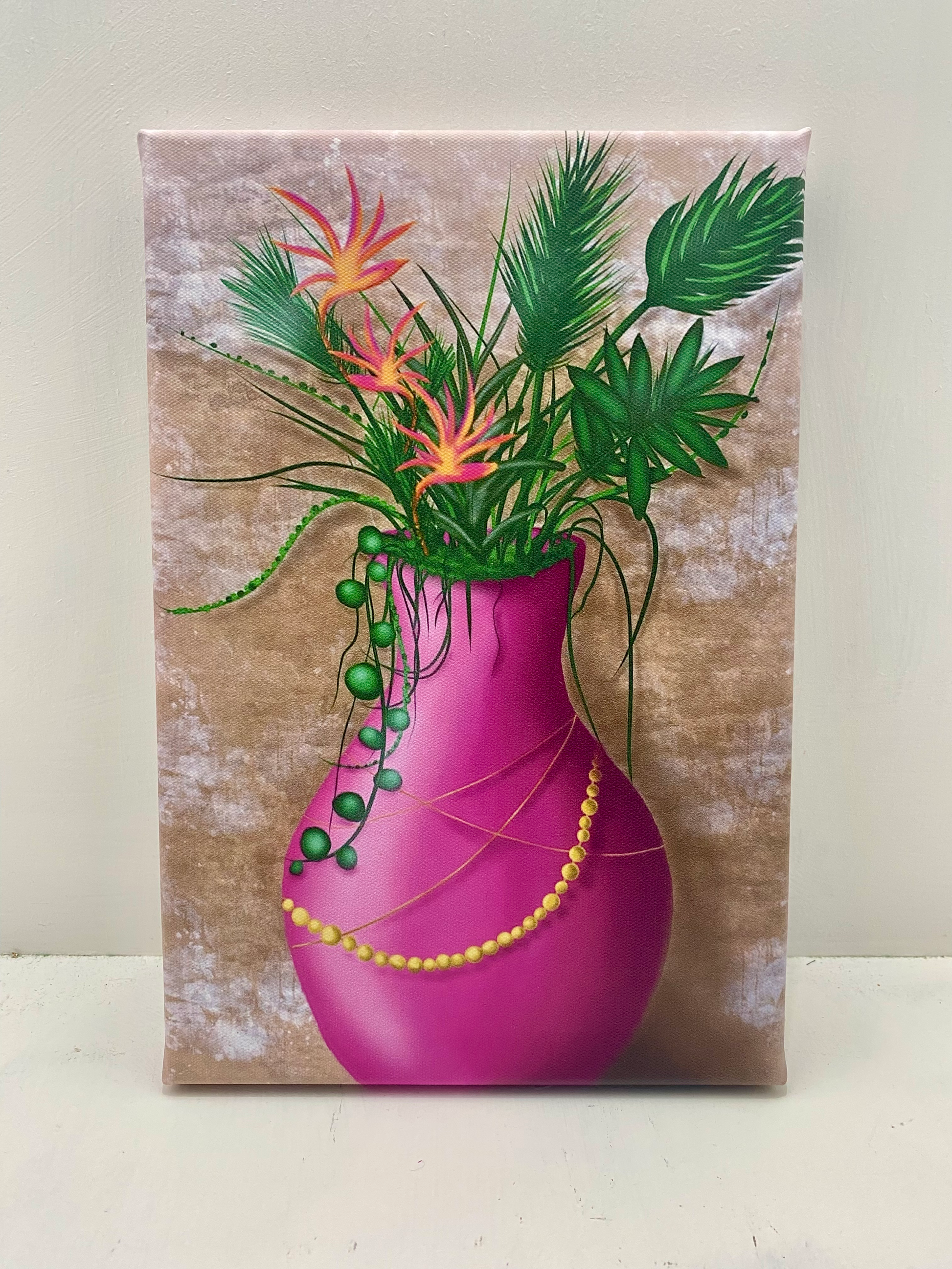 A striking piece of art work showing a quaint pink plant pot. This piece will elevate any wall that it is on.